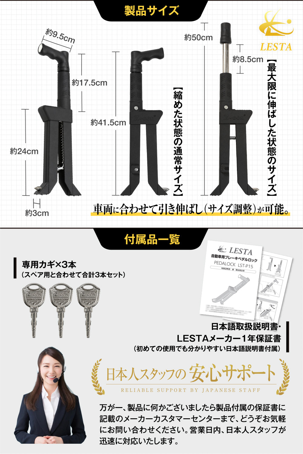 ✅【 充実の “専用カギ 3本” が付属 】複製されにくいデザインの鍵でしっかりとガード : 車のブレーキペダルに取り付けて固定し、車の盗難を防止します。万が一、車内に侵入されても、専用の鍵でロックを解除しない限りエンジンの始動などが難しく、持ち去ることは困難となります。 ✅ 製品同梱内容 : ブレーキペダルロック本体×1、専用カギ×3、LESTA取扱説明書&メーカー保証書×1。