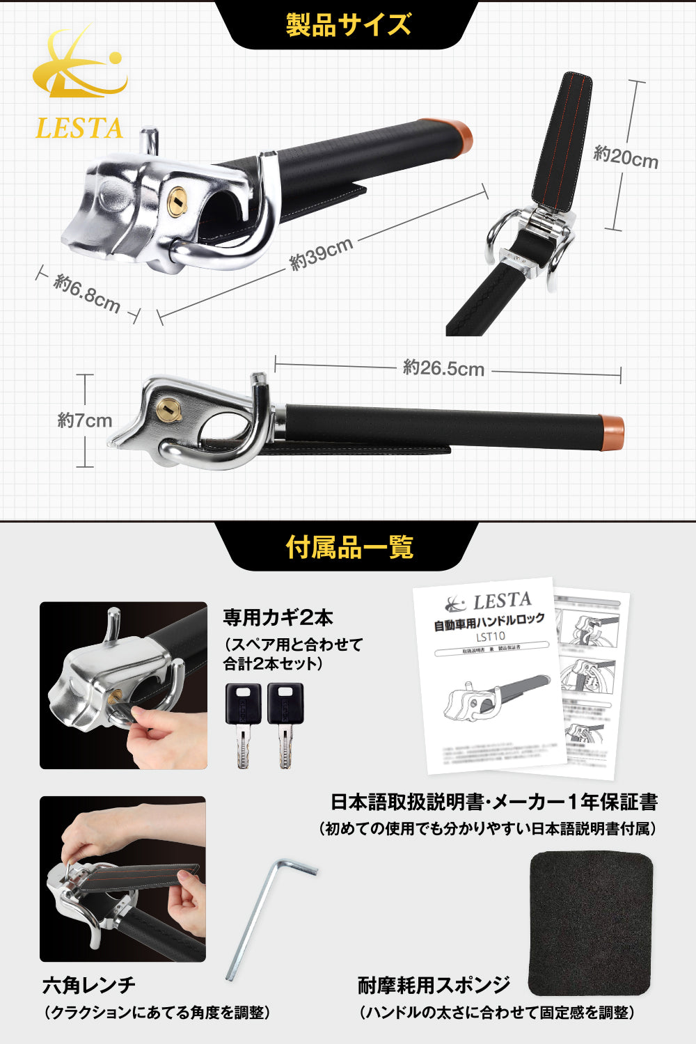 ✅ 製品同梱内容 : ハンドルロック本体×1、専用カギ×2、LESTA取扱説明書&メーカー保証書×1、六角レンチ(クラクションに当てる角度を調整)×1、耐摩耗用スポンジ(ハンドルの太さに合わせて固定感を調整)×1。