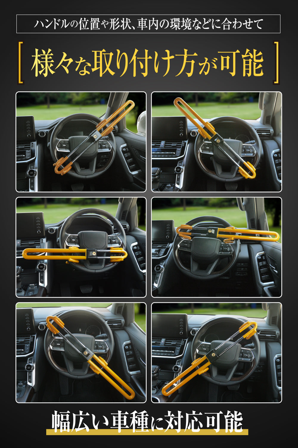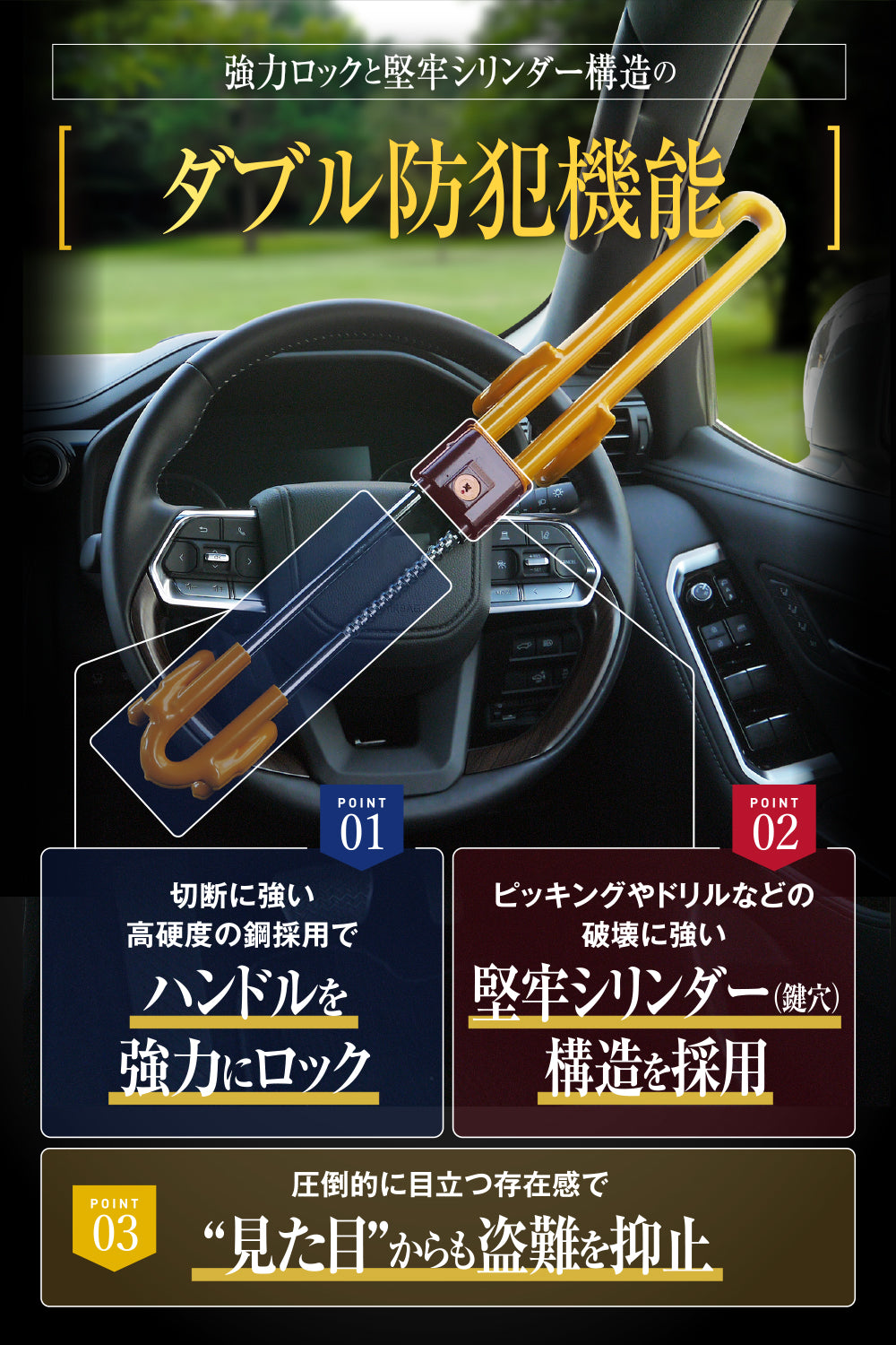✅【 強力なハンドルロックと堅牢シリンダー(鍵穴)構造の “ダブル防犯機能“ を搭載 】✅ポイント1「 強力なハンドルロック( 2本の鋼で強力ロック ) 」 : ロック部分に高品質で高硬度の鋼を使用することで、簡単に切断されない “業界内でもトップクラス” の強力なハンドルロックを実現。“2本の鋼で強力にロック”し、圧倒的な盗難防止能力を発揮します。 ✅ポイント2「 堅牢シリンダー(鍵穴)構造を採用 」 : ピッキングやドリルなどによる破壊に強いシリンダー(鍵穴)構造を採用。ハンドルロック本体だけでなく、シリンダー(鍵穴)破壊による盗難を防ぎます。 ✅ポイント3「 圧倒的に目立つ存在感で”見た目“からも盗難を抑止 」 : 強力なロック性能や堅牢シリンダー構造だけでなく、圧倒的に目立つハンドルロックを取り付ける事により、車外から見た時の”見た目“からも盗難を抑止します。