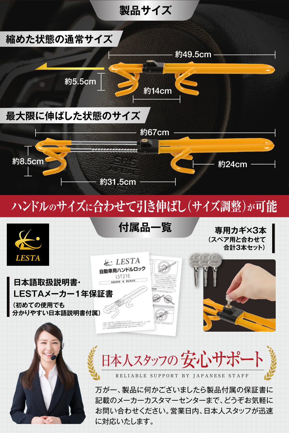 ✅【 カンタンに取り付け可能 】“製品本体を伸ばして、ハンドルに引っ掛けるだけ。” カンタンに取り付けが可能です。 ✅【 充実の “専用カギ 3本” が付属 】製品同梱内容 : ハンドルロック本体×1、専用カギ×3、LESTA取扱説明書&メーカー1年保証書×1。